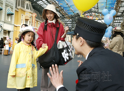 4月15日上午,“梦想与魔法的王国”——东京迪士尼乐园举行了开业30周年纪念庆典。图为当天前来游玩的母女。(共同社)