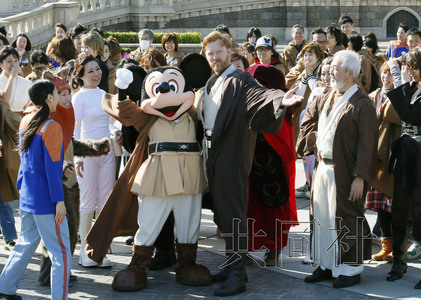 5月7日,东京迪士尼乐园经改造升级的“星际旅行”游乐项目正式开放。图为装扮成电影《星球大战》中角色受邀来捧场的游客。(共同社)